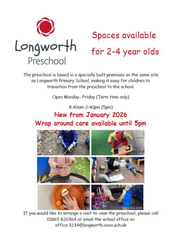 If you would like to arrange a visit to view the Pre-school, please call 01865 820364 or email the school office on office.3234@longworth.oxon.sch.uk.